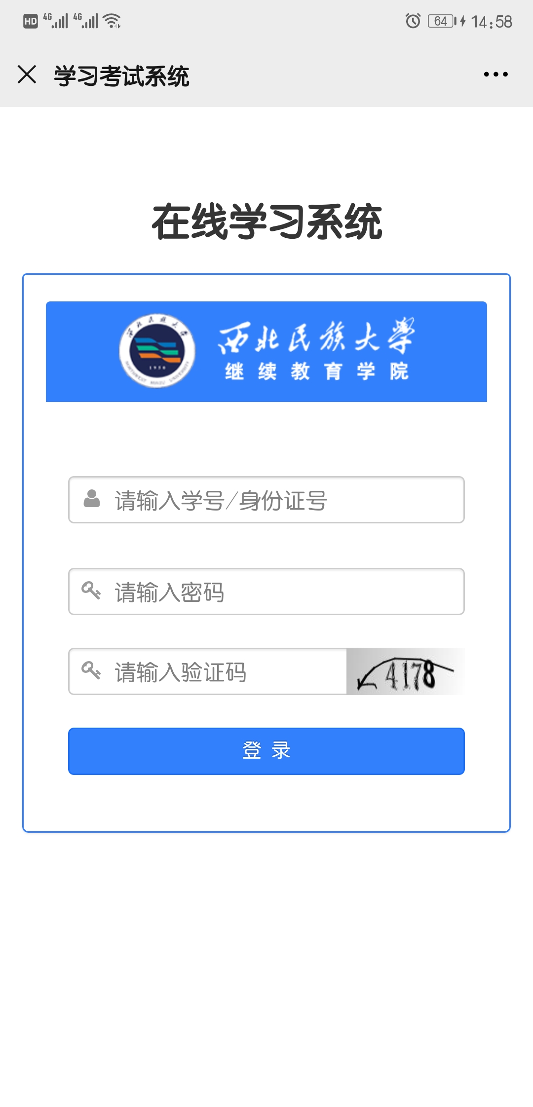 練習完成后點擊提交可以獲取答案等相關知識點,也可重復提交,系統保留最高成績。 二、PC端學習流程 網絡教學平臺是西北民族大學成人教育網絡在線學習系統的主干,也是學生主要的網絡學習工具。學生可以按照如下流程進行學習或查看相關信息。 (一)登錄 學員登錄“西北民族大學在線學習系統”(網址:https://testonline.bjxtwlkj.com/kaoshi/xxlogin.html),進入登錄界面,用戶名:身份證號碼或學號,密碼:出生年月日8位(例如19891023)。