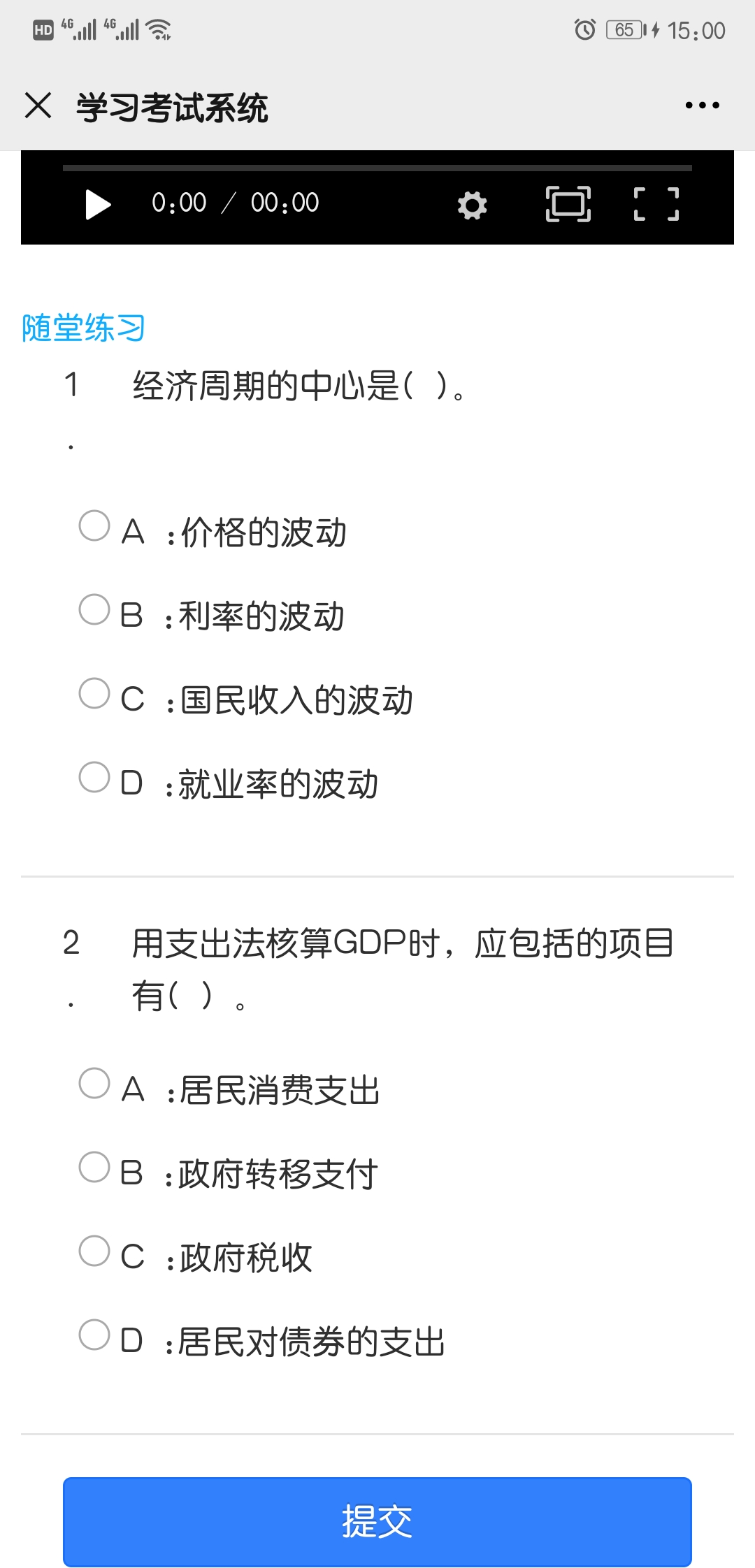 考核 點播課件完成后,平臺會記錄該位學生的課件點播學習時長,以此作為統計該門課程成績(或學分)的依據。 學校會階段性地為每門課程準備部分隨堂練習題,用于鞏固該門課程的知識點。學生可以通過點擊下圖的“隨堂練習”進入練習界面:
