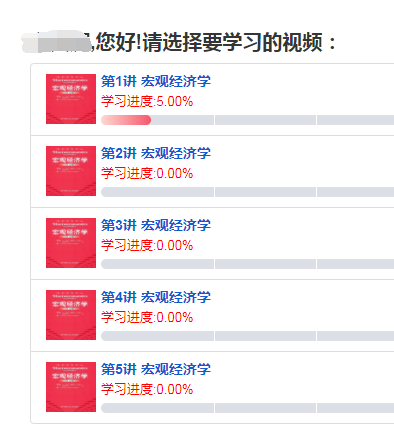 該頁面顯示學生目前開設的課程。例如專升本會計學專業開設的課程主要包括宏觀經濟學、微觀經濟學、概率論與數理統計、線性代數等。 每門課程封皮右側顯示課程的名稱基本信息,以宏觀經濟學為例,課件點播后進度條會顯示學習進度,課程全部聽完后會顯示100%。點擊“相應課程名稱”即進入課程學習頁面: