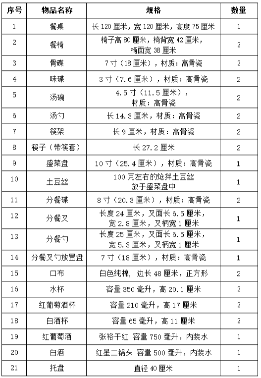 酒店管理類|山東省2023年春季高考技能測試試題或考試范圍發表時間:2023-03-04 14:01 2023年春季高考共30個類別,分別是現代農藝、烹飪、畜牧養殖、建筑、機械制造、設備維修、機電技術、自動控制、電氣技術、電子技術、化工與環境、服裝、車輛維修、運輸、數字媒體、網絡技術、軟件與應用技術、醫學技術、藥學、護理、財稅、市場營銷、電子商務、國際商務、物流管理、酒店管理、旅游管理、公共服務與管理、學前教育、藝術設計。 依據《山東省春季高考統一考試招生專業類別考試標準》(山東省教育招生考試院2022年11月發布),山東省2023年春季高考酒店管理類專業考試考試范圍如下: 【一】主考院校 山東旅游職業學院 【二】酒店管理類專業考試范圍 山東省2023年春季高考技能測試酒店管理類專業測試內容為中餐零點擺臺與服務,總分值230分。 一、考試說明 1.考生按規定時間進入備考室進行準備,備考期間全程佩戴口罩。考生按照序號進入考場進行考試,考試期間考生不得中途離場。 2.進入考場前,驗證、簽到,并進行手部消毒。 3.考生進入考場后,按流程開始考試。儀容儀表檢查1分鐘,準備時間1分鐘,技能操作時間6分鐘,技能操作時間進行到5分30秒時,工作人員舉牌提醒一次,6分鐘停止操作。 4.考場提供兩人位零點餐桌,主人位在地面有標識,分餐區域在工作臺有標識。 5.考生著裝、語言等不能泄露個人及所在單位信息。 二、考試內容 中餐零點擺臺與服務、服務禮儀 三、考試要求 1.考生須服從工作人員安排,保持考場秩序。 2.按中餐零點擺臺與服務的流程進行操作。 3.考生聽口令進行準備,準備時間1分鐘,考生準備就緒后,舉手示意。 4.考生在考評員宣布“考試開始”后,開始操作。 5.操作結束后,考生回到工作臺前,舉手示意“操作完畢”。 6.操作過程符合行業規范,動作嫻熟、敏捷、優美。 7.考生在考試過程中如因個人原因導致物品損壞,不予補充。 四、考場配備物品(以一個考場為例,物品圖片見公示清單)