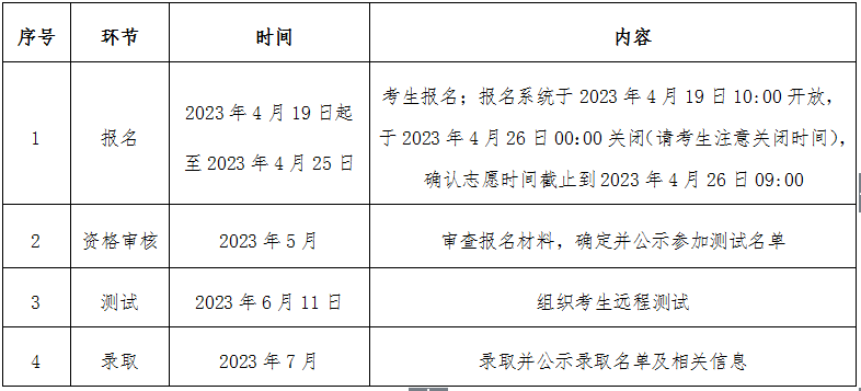 報名時間2023年4月19日 - 2023425報名系統于2023419日10:00開放,于202342600:00關閉(請考生注意關閉時間),確認志愿時間截止到202342609:00,未確認志愿的考生報名無效。