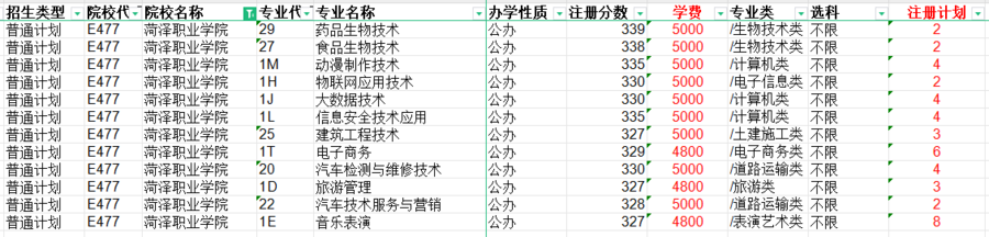 2023年山東省注冊入學(xué)計劃已經(jīng)公布,公辦學(xué)校16所,民辦學(xué)校29所,公辦計劃數(shù)1852,民辦計劃數(shù)6127,藝術(shù)類計劃324,體育類計劃44,春季高考計劃數(shù)3333。 一、學(xué)校簡介 菏澤職業(yè)學(xué)院是全日制普通高等學(xué)校。目前,菏澤職業(yè)學(xué)院在校生15000余人,在崗教職工660人,其中專任教師565人,教授、副教授119人,碩士、博士研究生286人,“雙師型”教師226人,國家級、省級優(yōu)秀教師58人。校內(nèi)實訓(xùn)基地總建筑面積已達到10萬平方米,教學(xué)科研儀器設(shè)備總值1.5億元,校內(nèi)實踐教學(xué)工位超1萬個。現(xiàn)有機電工程系、信息工程系、交通工程系、商貿(mào)物流系等12個院系和電子商務(wù)、網(wǎng)絡(luò)安全、物聯(lián)網(wǎng)技術(shù)、新能源汽車技術(shù)、食品生物技術(shù)等38個招生專業(yè)。2022年被省委省政府表彰為山東省人才工作表現(xiàn)突出單位,連續(xù)四年在全市事業(yè)單位績效考核中取得優(yōu)秀等次。 二、菏澤職業(yè)學(xué)院2023年注冊入學(xué)計劃及錄取分數(shù)線