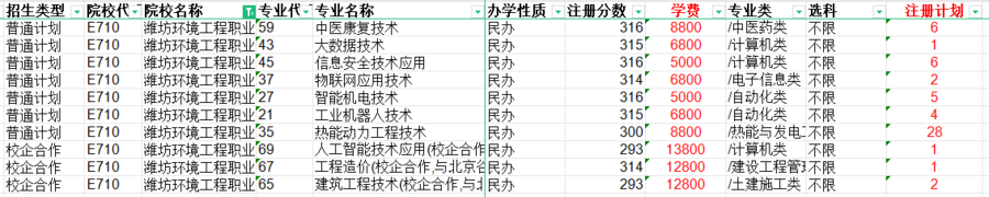 2023年山東省注冊入學計劃已經公布,公辦學校16所,民辦學校29所,公辦計劃數1852,民辦計劃數6127,藝術類計劃324,體育類計劃44,春季高考計劃數3333。 一、學校簡介 濰坊環境工程職業學院是經山東省人民政府批準設立的山東省唯一一所以服務生態文明建設和綠色發展為辦學主導方向的高等院校。學院占地850余畝,已投資15億元,建成教學樓、宿舍樓、實訓樓、圖書館、餐廳等23棟建筑,建設面積達28萬平方米,可滿足10000多名在校生學習和生活。學院構建了以智能制造為基礎、以信息技術為支撐、以環境保護為特色、以健康養生為保障,以文化藝術為拓展、以國防預備役人才培養為亮點的六個二級學院,開設環境監測技術、計算機應用技術、書畫藝術等28個專業。學校被評為“山東省產教融合示范學校”“山東省教育系統優秀基層黨組織”“中國生態環境產教聯盟會員單位”等榮譽稱號。 二、濰坊環境工程職業學院2023年注冊入學計劃及錄取分數線 1、夏季高考普通類