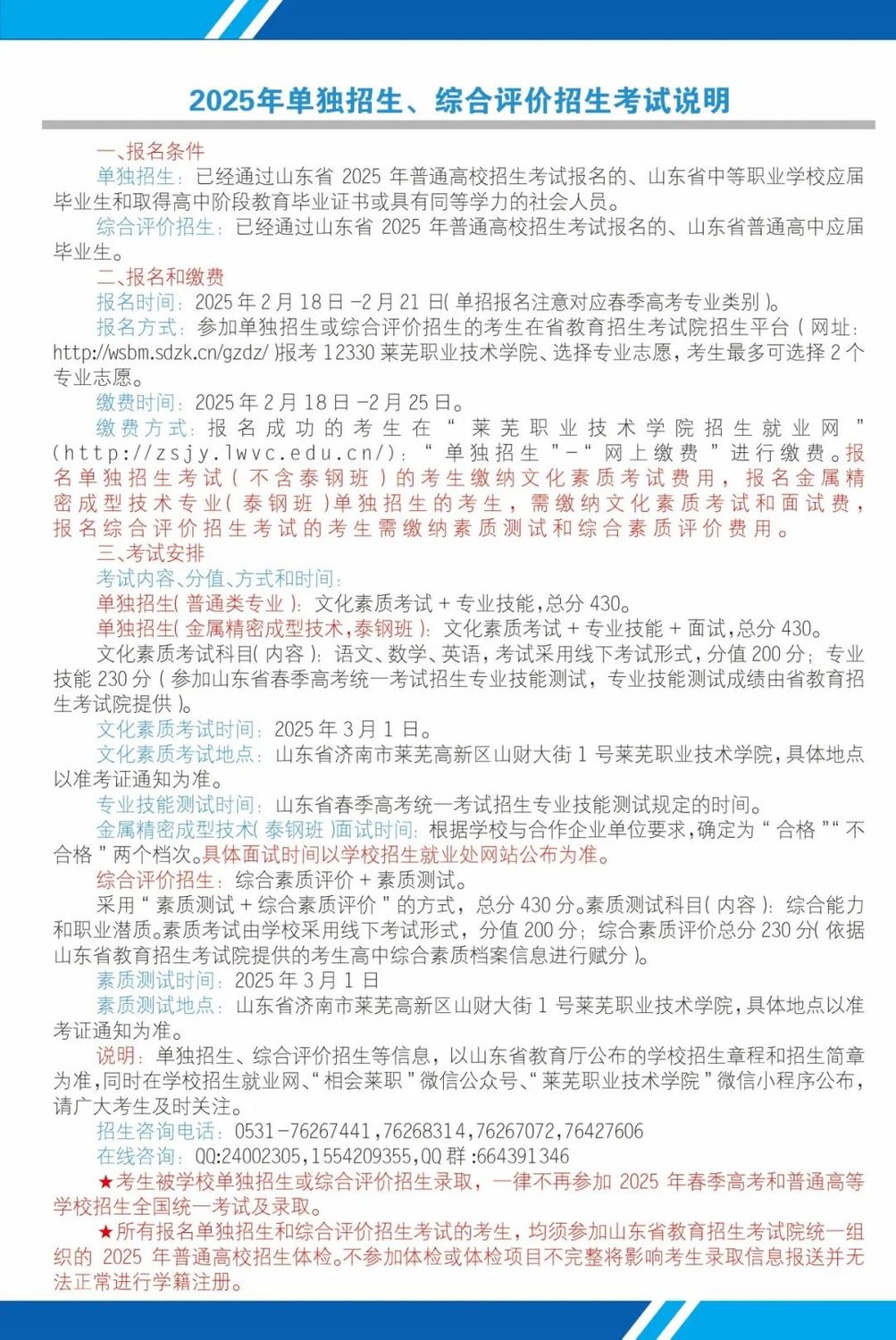 2025年萊蕪職業(yè)技術(shù)學(xué)院?jiǎn)为?dú)招生、綜合評(píng)價(jià)招生考試情況說(shuō)明
