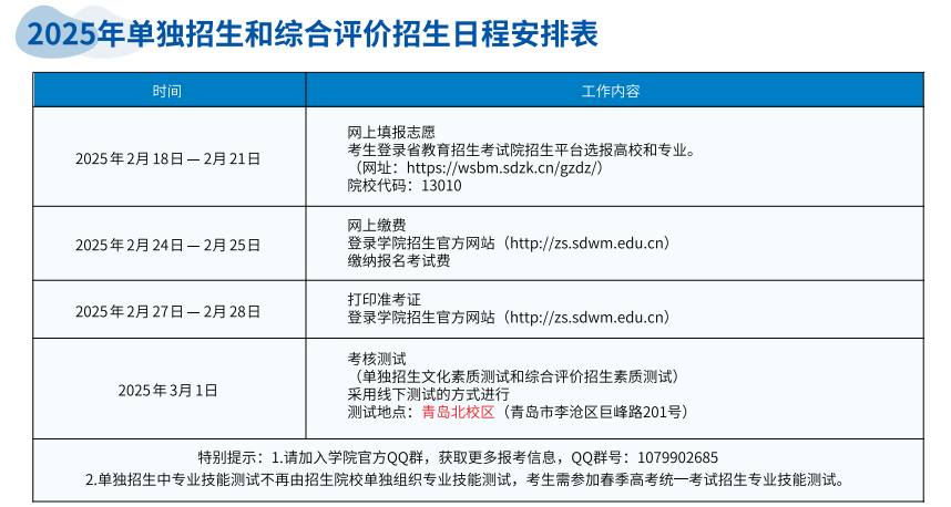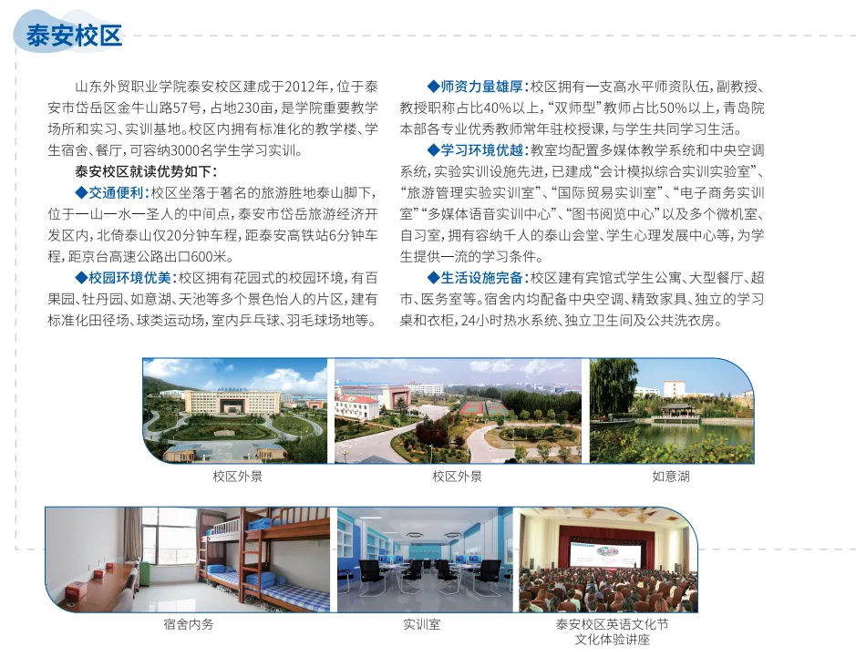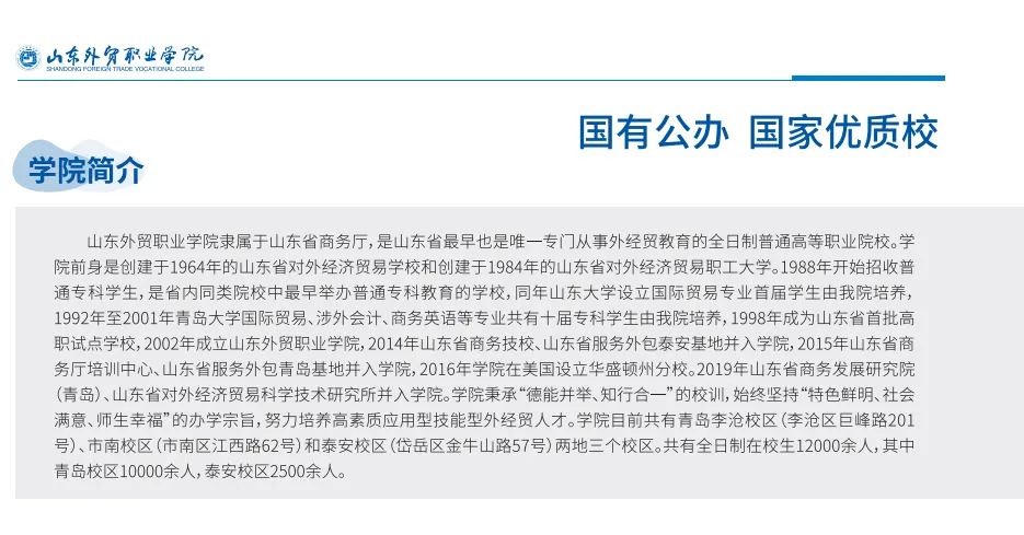 2025年山東外貿職業學院單獨招生和綜合評價招生計劃和考試內容發表時間:2025-01-23 16:46 山東外貿職業學院簡介 山東外貿職業學院隸屬于山東省商務廳,是山東省最早也是唯一專門從事外經貿教育的全日制普通高等職業院校。學院前身是創建于1964年的山東省對外經濟貿易學校和創建于1984年的山東省對外經濟貿易職工大學。1988年開始招收普通專科學生,是省內同類院校中最早舉辦普通專科教育的學校,同年山東大學設立國際貿易專業首屆學生由我院培養,1992年至2001年青島大學國際貿易、涉外會計、商務英語等專業共有十屆專科學生由我院培養,1998年成為山東省首批高職試點學校,2002年成立山東外貿職業學院,2014年山東省商務技校、山東省服務外包泰安基地并入學院,2015年山東省商務廳培訓中心、山東省服務外包青島基地并入學院,2016年學院在美國設立華盛頓州分校。2019年山東省商務發展研究院(青島)、山東省對外經濟貿易科學技術研究所并入學院。學院秉承“德能并舉、知行合一”的校訓,始終堅持“特色鮮明、社會滿意、師生幸福”的辦學宗旨,努力培養高素質應用型技能型外經貿人才。學院目前共有青島李滄校區(李滄區巨峰路201號)、市南校區(市南區江西路62號)和泰安校區(岱岳區金牛山路57號)兩地三個校區。共有全日制在校生12000余人,其中青島校區10000余人,泰安校區2500余人。 學院榮譽: 國家優質高等職業院校 山東省第一批優質高等職業院校 山東省技能型人才培養特色名校 青島市首批品牌職業院校 全國外經貿職業教育教學指導委員會副主任委員單位 教育部職業院校外語類專業教學指導委員會委員單位 全國外經貿職業教育教學指導委員會商務外語專業指導委員會主任委員單位 中國高職研究會商科分會副主任委員單位 中國高職研究會商科分會外語專業委員會主任委員單位 山東省外經貿職業教育專業建設指導委員會牽頭單位 山東省外語職業教育專業建設指導委員會牽頭單位 山東省國際商務職業教育集團理事長單位 山東省跨境電商產教聯盟理事長單位 山東省德育教育優秀學校 山東省依法治校示范校 山東省省級文明單位 青島市文明校園 全國職業院校數字校園建設樣板校 山東省第一批教育信息化試點單位和山東省教育信息化示范單位 山東省唯一國家援外培訓項目綜合性承辦執行機構 山東省重點服務外包人才培訓基地 山東省跨境電子商務培訓基地 山東省全域旅游人才培訓基地 山東省非物質文化遺產傳承教育實踐基地 青島口岸自貿區政策知識培訓基地 學院各專業緊密對接區域開放型經濟和涉外高端服務業,已形成了外貿、外語、外運、外包為主的鮮明的“外”字辦學特色。現開設24個專業,其中,國際貿易實務、報關與國際貨運、旅游管理、電子商務、商務英語、會計、國際金融、軟件技術、保險、國際商務等為國家級骨干專業;物流管理為省級特色專業;國際貿易實務專業群、國際商旅服務專業群、商務外語專業群、財會金融專業群、國際運輸與物流專業群5個省高水平專業群;國際經濟與貿易、會展策劃與管理、金融服務與管理、旅游管理、市場營銷、大數據與會計等六個專業分別與山東青年政治學院、山東女子學院、棗莊學院、臨沂大學、齊魯師范學院等聯合培養“3+2”專本貫通學生;國際貿易實務、會計為央財支持重點建設專業;旅游管理專業為全國職業院校旅游類示范專業點;1987年與中國對外貿易運輸公司聯合舉辦的“外貿運輸”訂單班為全國首個,國際運輸與物流管理、國際貿易品牌群、財會金融品牌群為省級品牌專業群;國際貿易實務、物流管理、電子商務、會計、動漫制作技術、報關與國際貨運、旅游管理獲批山東省和青島市現代學徒制試點專業;商務英語、報關與國際貨運、電子商務、市場營銷、民航運輸、國際金融為青島市高職重點專業;牽頭建設國際貿易實務、軟件與服務外包、會計、動漫設計與制作、空中乘務、商務日語、電子商務7個青島市中高職專業辦學聯盟。 2025年山東外貿職業學院單招綜評招 生 計 劃 考生須通過山東省2025年普通高校考試招生(含春季高考和夏季高考)報名后,方可報名參加單獨招生或綜合評價招生。 單獨招生和綜合評價招生報名: 1.報名形式:符合條件的考生登錄山東省教育招生考試院統一招生平臺,網上填報志愿。 2.報名網址:https://wsbm.sdzk.cn/gzdz/ 3.報名時間:2025年2月18日-2月21日(請考生在省教育招生考試院報名平臺開放時間內按時填報志愿)。 4.具體報名、考試等相關事宜,請認真閱讀《山東外貿職業學院2025年高職(專科)單獨招生和綜合評價招生章程》,章程待山東省教育廳審核通過后在學院招生網站公布。 ![]() 注:退役軍人類錄取后編入全日制班級學習。 ![]() 考 核 測 試 說 明 (一)單獨招生 采取“文化素質+專業技能”的考試方式(退役士兵考生除外)。總分為430分,專業技能測試成績230分,文化素質考試成績200分,均以原始成績計入總分。 1.文化素質考試 考試時間:2025年3月1日 考試科目及形式: ![]() 2.專業技能測試 專業技能測試工作上由省教育招生考試院統一組織,可根據需要采用筆試、實際操作,或筆試與實際操作相結合的方式進行。考生參加由省教育招生考試院組織的春季高考統一考試招生專業技能測試,測試成績由招生院校認可,按考生實際
