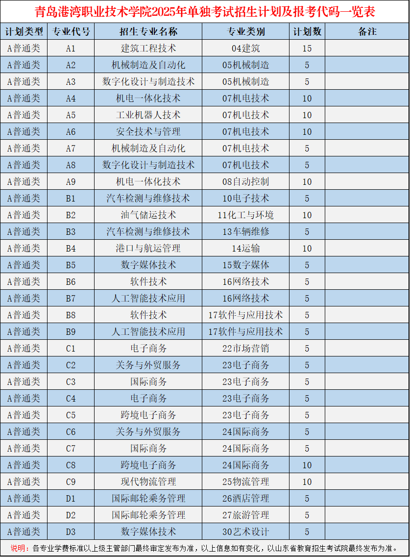 青島港灣職業技術學院2025年單獨招生和綜合評價招生總計劃500人,其中單獨招生計劃200人,綜合評價招生計劃300人,現將具體分專業招生計劃予以發布。