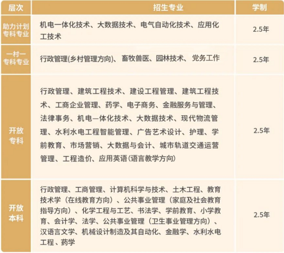 溫馨提示:名額有限,建議盡早報名! 五、招生專業(yè)國家開放大學(xué)提供多種專業(yè)選擇,涵蓋專科和本科層次。 ![]() 六、畢業(yè)條件學(xué)生學(xué)籍自注冊入學(xué)起八年內(nèi)有效,高中起點本科專業(yè)最低修業(yè)年限五年,專科起點本科專業(yè)、專科專業(yè)最低修業(yè)年限均為兩年半。國家開放大學(xué)實行學(xué)分制。學(xué)生在學(xué)籍有效期內(nèi)取得規(guī)定的畢業(yè)所需學(xué)分、符合畢業(yè)條件,準(zhǔn)予畢業(yè)并頒發(fā)國家開放大學(xué)畢業(yè)證書。畢業(yè)證書、學(xué)位證書均可在中國高等教育學(xué)生信息網(wǎng)(www.chsi.com.cn)查詢。本科學(xué)生符合條件的可按規(guī)定申請國家開放大學(xué)學(xué)位。 ![]() 學(xué)生需在學(xué)籍有效期內(nèi)修滿規(guī)定學(xué)分,完成課程作業(yè)和考試,專科學(xué)生需提交實習(xí)報告,本科學(xué)生需完成畢業(yè)論文。 七、其他注意事項
