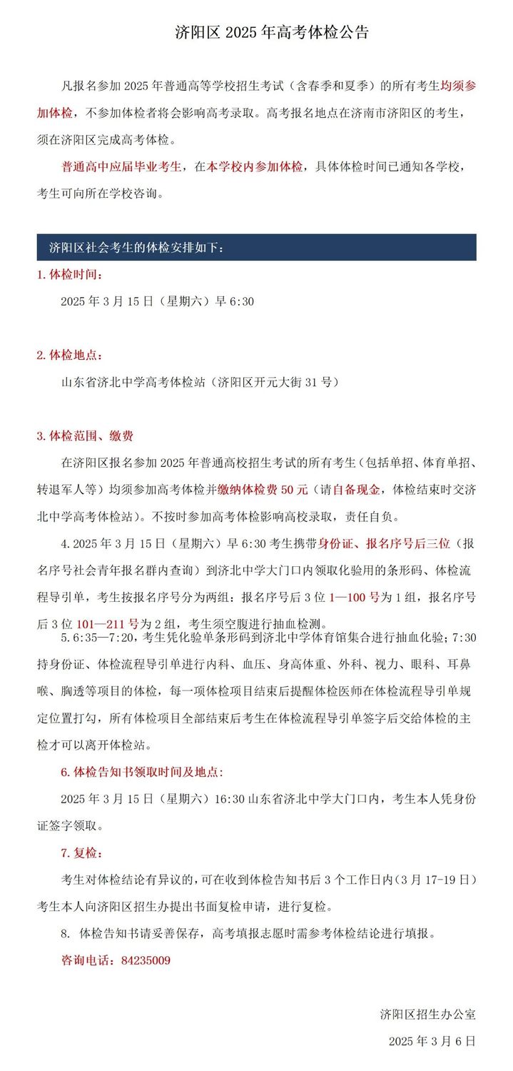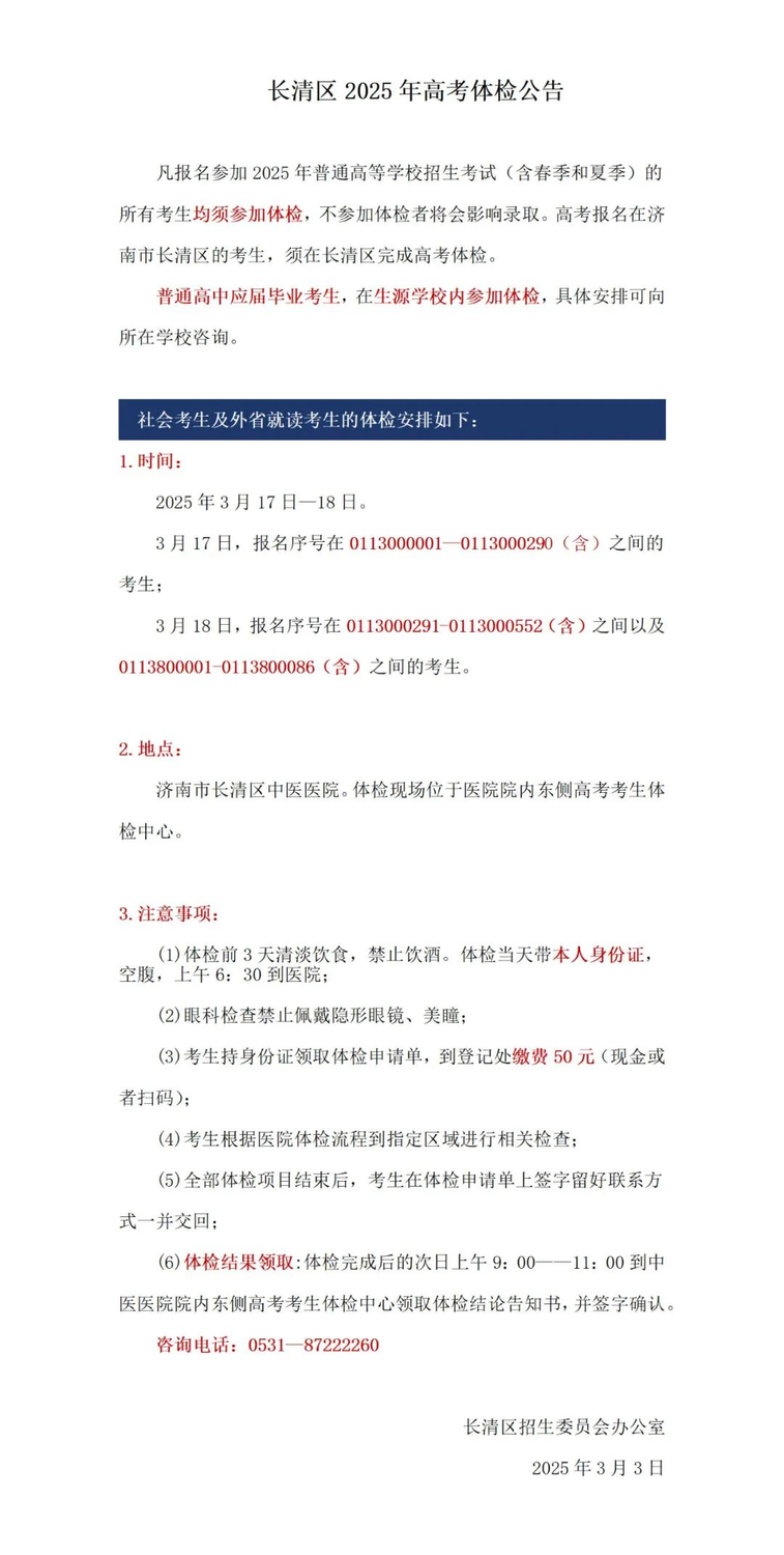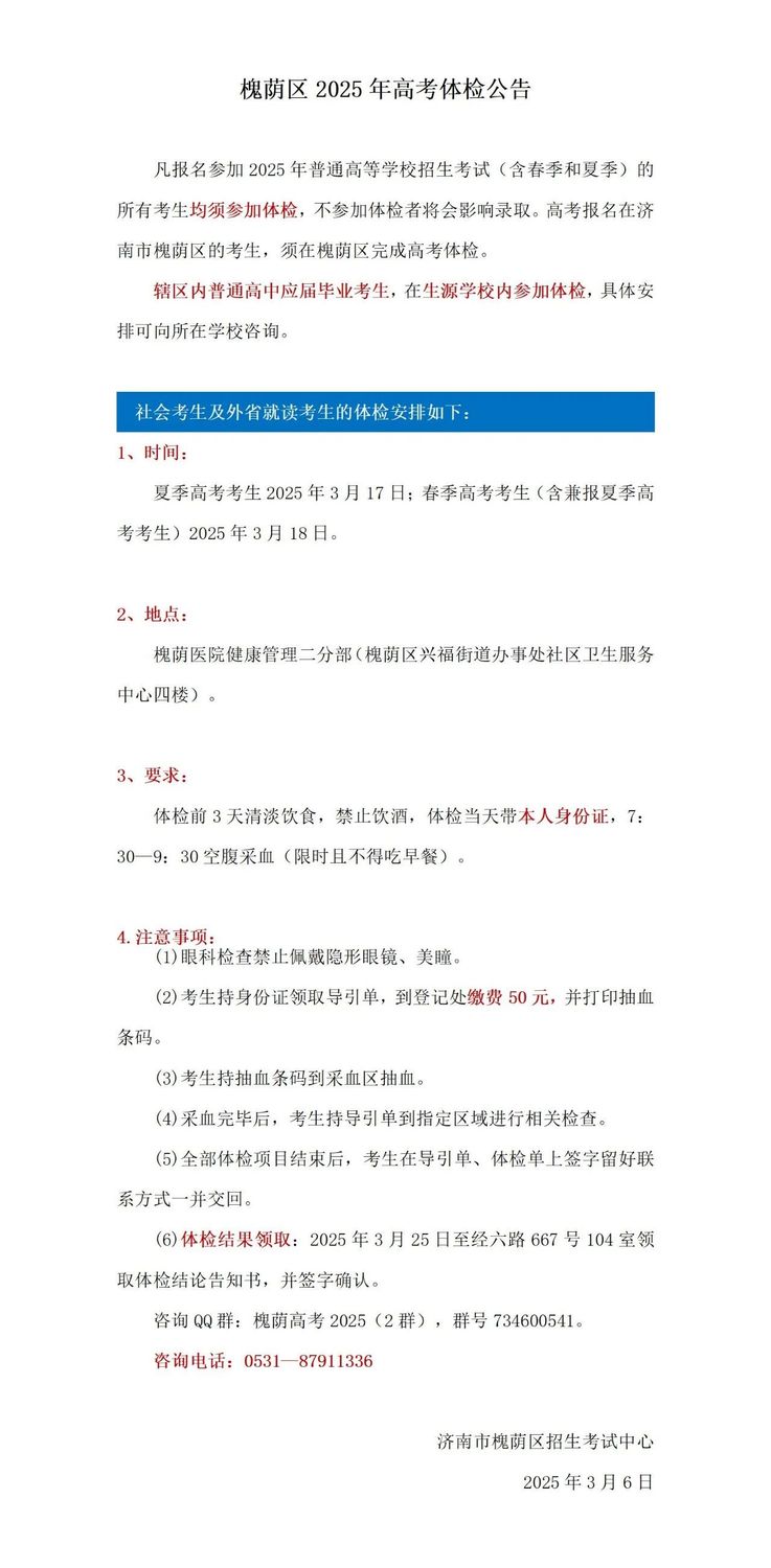 山東16市2025年高考體檢時間安排匯總發表時間:2025-03-20 21:53 根據山東省體檢工作安排,體檢工作于2025年3月3日—3月31日進行。各市、縣(市、區)可在此期間自行安排具體體檢時間,并向考生發布具體的體檢時間安排和要求。 特別提醒各位考生,凡是報名參加2025年普通高等學校(以下簡稱高校)招生考試(含春季和夏季)的所有考生(應屆生、社會考生)均須參加體檢。體檢工作開始之前已被高職(專科)單招和綜合評價招生錄取的考生(包含退役士兵考生)必須參加體檢。 填報軍事、公安、武警等高校志愿的考生還須參加由省軍區、省公安廳組織的軍檢、面試或體能測試。 濟南市歷下區