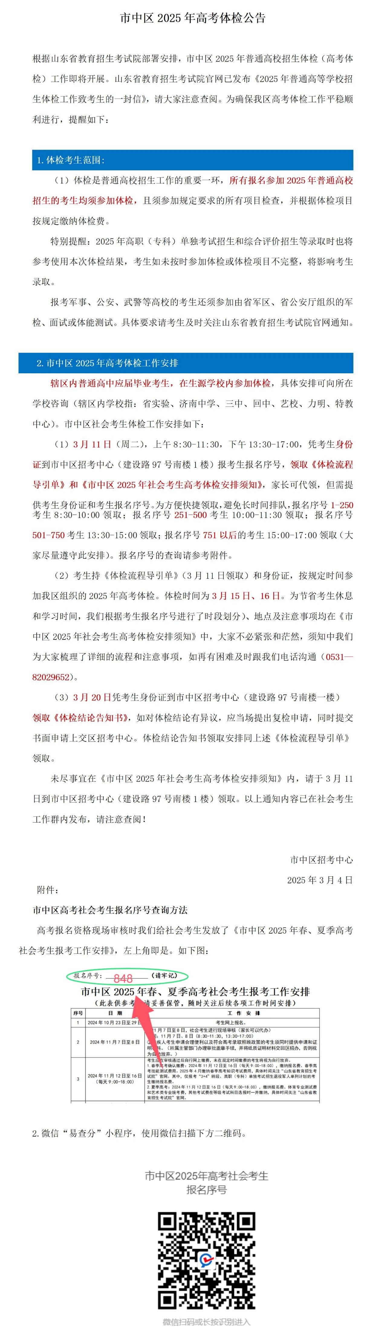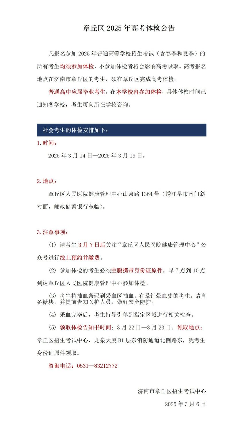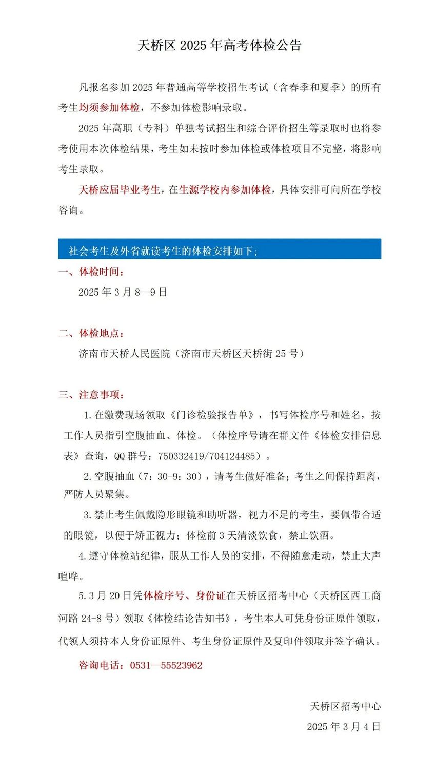 山東16市2025年高考體檢時間安排匯總發表時間:2025-03-20 21:53 根據山東省體檢工作安排,體檢工作于2025年3月3日—3月31日進行。各市、縣(市、區)可在此期間自行安排具體體檢時間,并向考生發布具體的體檢時間安排和要求。 特別提醒各位考生,凡是報名參加2025年普通高等學校(以下簡稱高校)招生考試(含春季和夏季)的所有考生(應屆生、社會考生)均須參加體檢。體檢工作開始之前已被高職(專科)單招和綜合評價招生錄取的考生(包含退役士兵考生)必須參加體檢。 填報軍事、公安、武警等高校志愿的考生還須參加由省軍區、省公安廳組織的軍檢、面試或體能測試。 濟南市歷下區