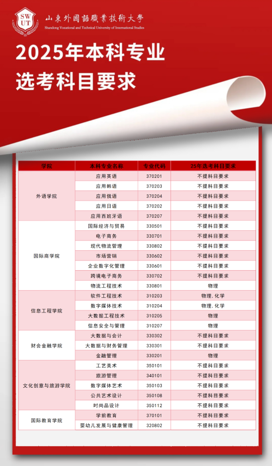 2025年,山東外國語職業技術大學共設43個招生專業,含26個本科專業與17個專科專業。其中,職業本科擴招400人,新增應用西班牙語、物流工程技術、公共藝術設計、時尚品設計4個本科專業。以下是本專科專業選考科目要求的詳細說明,供廣大考生參考。